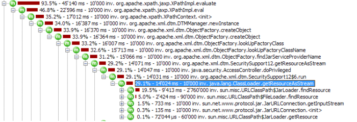 It can be seen that every one of the 10k test XPath evaluations led to the classloader trying to lookup the DTMManager instance in some sort of default configuration. This configuration is not loaded into memory but accessed every time. Furthermore, this access seems to be protected by a lock on the ObjectFactory.class itself. When the access fails (by default), then the configuration is loaded from the xalan.jar file’s configuration file: